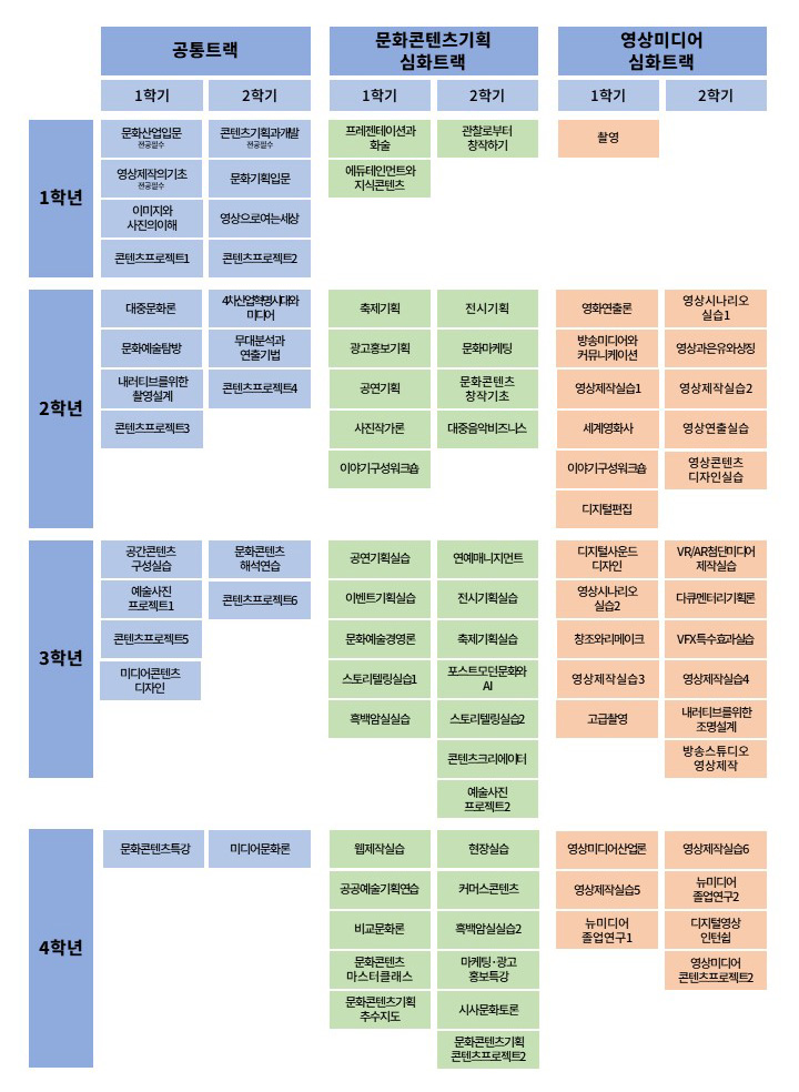문화영상학부는 문화콘텐츠기획트랙과 영상미디어트랙으로 구성되어 문화콘텐츠산업 전반에 걸친 다양한 지식과 전문가적인 자질을 함양할 수 있습니다.
